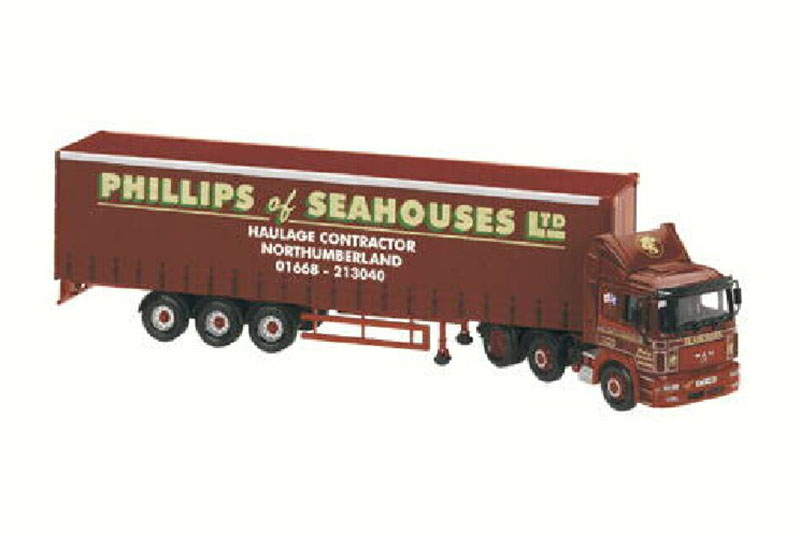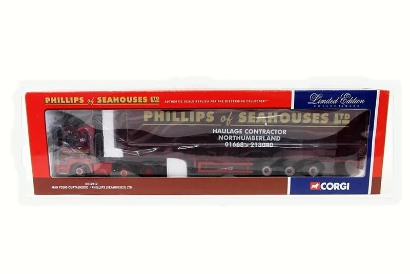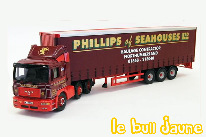 MAN F2000 PhillipsRéférence OCCCC12012Marque : M.A.NFabricant : CORGIEchelle : 1/50° M.A.N. F 2000 6x2 semi remorque bâchée 3 essieux, Transport Phillips of Seahouses, GB |