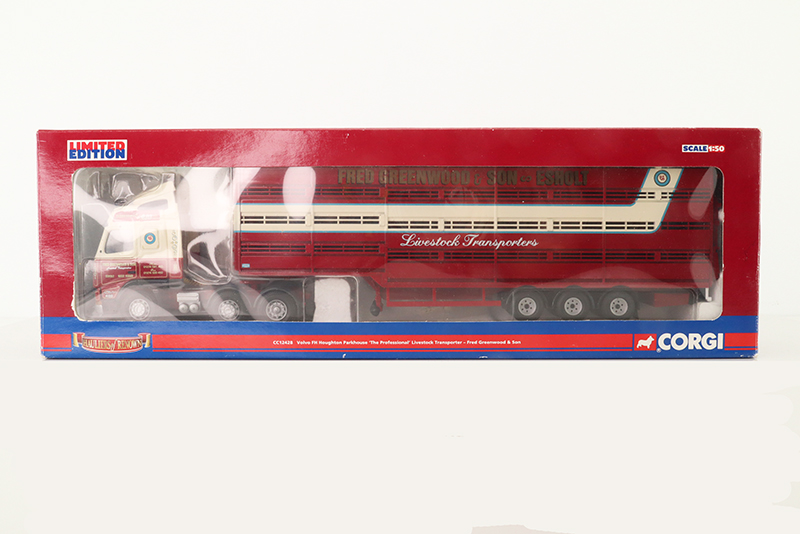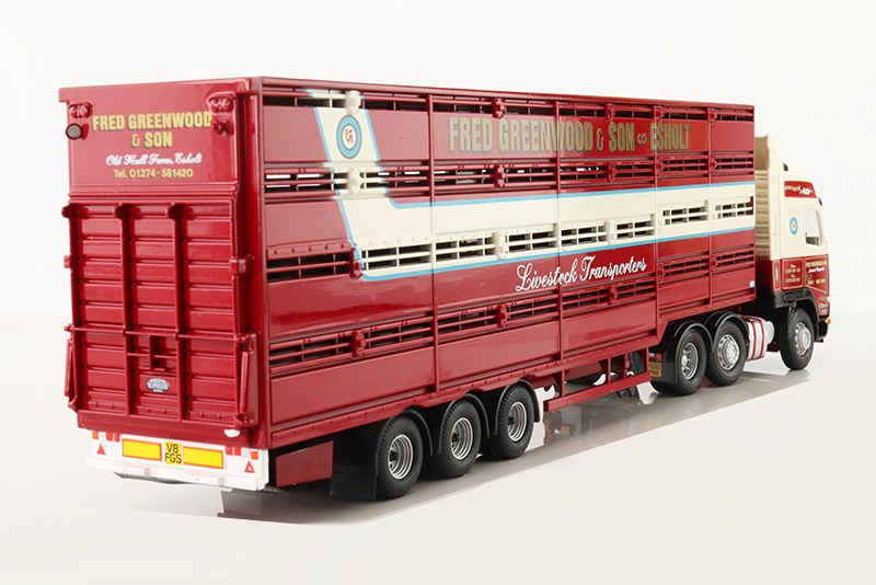 VOLVO FH12 Fred Greenwood & SonRéférence OCCCC12428Marque : VOLVOFabricant : CORGIAnnée : 2005 Echelle : 1/50° VOLVO FH 12 6x2 remorque bétaillère 3 essieux, Transport Fred Greenwood & Son, GB |