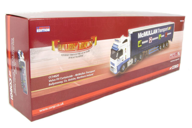 VOLVO FH12 McMullanRéférence OCCCC14020Marque : VOLVOFabricant : CORGIAnnée : 2009 Echelle : 1/50° VOLVO FH 12 Globetrotter 6x2 semi remorque Tautliner 3 essieux, McMullan Transport, Ballymoney, Co. Antrim, Northern Ireland |