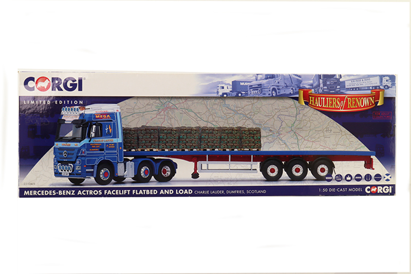 MB Actros Charlie LauderRéférence OCCCC13825Marque : MERCEDES BENZFabricant : CORGIAnnée : 2013 Echelle : 1/50° MERCEDES BENZ Actros MP03LH 6x2 semi remorque plateau 3 essieux avec chargement, Transport Charlie Lauder, Dumfries, Scotland, GB |