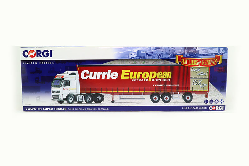 VOLVO FH12 Currie EuropeanRéférence OCCCC14040Marque : VOLVOFabricant : CORGIAnnée : 2014 Echelle : 1/50° VOLVO FH 12 Globetrotter XL 6x2 semi remorque tautliner 3 essieux, Transport Currie European, Dumfries, Scotland, GB |